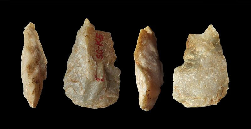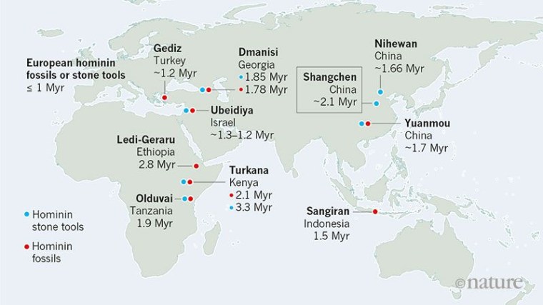 Since discovery in 2010 that remains of the genus Homo at Dmanisi in Georgia were about 1.85 Ma old several more instances of bones and stone tools a few hundred thousand years less than that age have turned up in China. All have been ascribed to H. erectus, although there are dissimilarities with African examples of the species and its predecessor H. ergaster. The technological breakthrough that led H. erectus/ergaster to knap the distinctive bifacial or Acheulean ‘handaxe’ was achieved at about the same time as the Dmanisi humans left Africa, yet there is no sign of such tools in eastern Asia until much later, most ancient artefacts there being of a more primitive, ‘Oldowan’ type. That is perhaps because more serviceable tools were fashioned from less durable materials than fine-grained rock that takes an edge. Maybe the skills were lost en route or the forebears of eastern Asian tool makers left Africa before the breakthrough. At any rate, the genus Homo is generally conferred on any being that had a tool-making culture, so that the presence of tools alone in a sedimentary deposit signifies that humans probably once inhabited that site. The earliest tools (3.3 Ma) from the Turkana area of Kenya were made half a million years before the first known appearance of well-documented remains of an un-named member of the genus Homo at Ledi-Geraru in Afar, Ethiopia (2.8 Ma). At sites in Olduvai, Tanzania (1.9 Ma) and Turkana, Kenya (2.1 Ma) fossils of Homo habilis are found in association with ‘Oldovan’ stone tools.