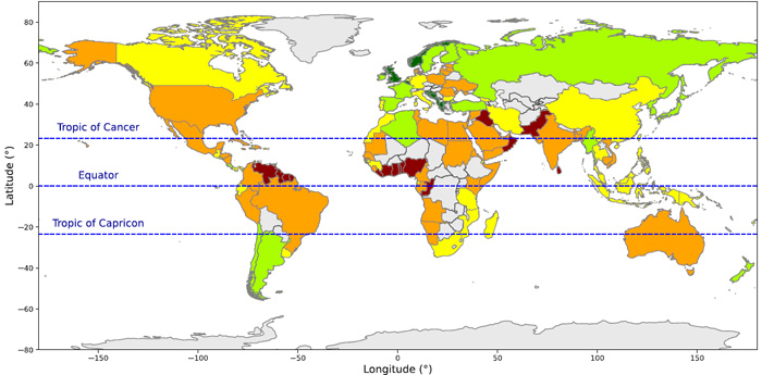Coastal vulnerability by country: dark blue – very low; green – low; yellow – moderate; orange – high; dark red – very high. (Credit: Basnayake et al. Fig 2a)