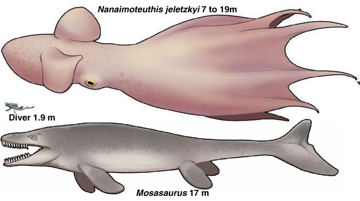 Ikegami et al. ground layer by layer through Japanese and Canadian sedimentary rocks to produce 3-D tomographic models of fossil beaks within them – quicker CT scanning proved inefficient in showing details. All the ‘beaks’ showed signs of wear from cracking the harder bones of their prey. Assuming that the same variation of beak size and body mass as in modern octopuses is relevant to those of Cretaceous age, the researchers came up with an astonishing result. Cretaceous octopuses reached huge sizes. They estimated one Nanaimoteuthis jeletzkyi to have been 19 metres long, roughly the size of an articulated truck. During the Cretaceous Period the top predator of the oceans had long been supposed to have been the formidable marine reptile Mosasaurus at around 15 m long.
