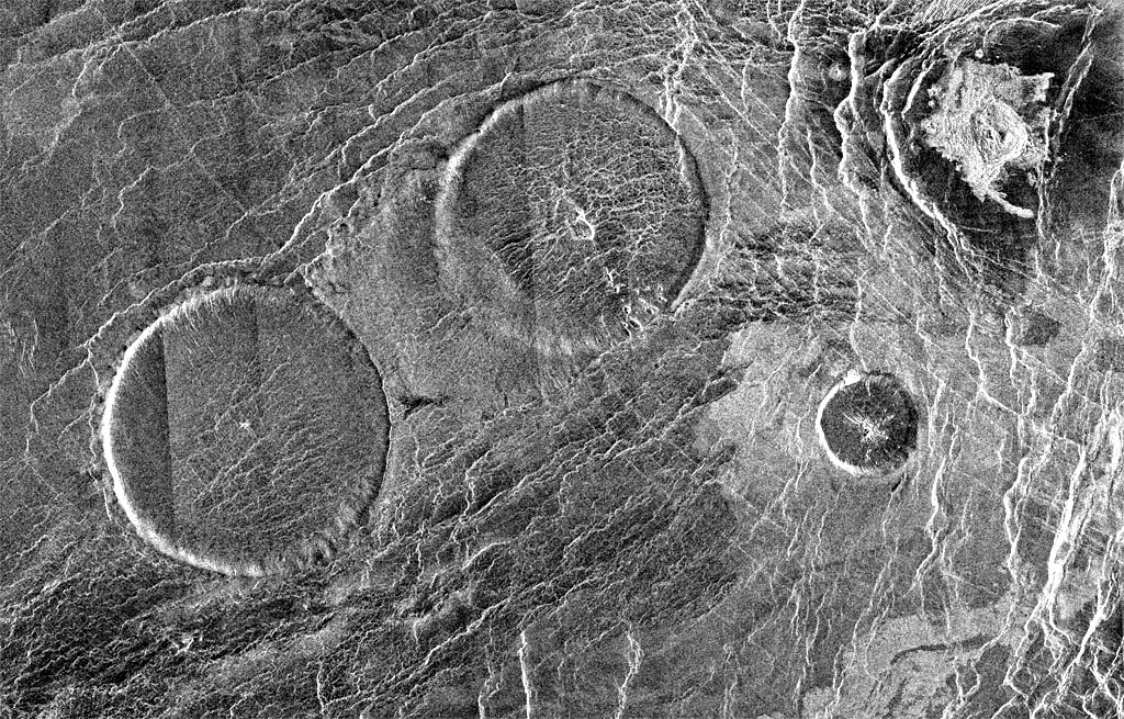 Volcanic ‘pancake’ domes on the surface of Venus, about 65 km wide and 1 km high, imaged by orbital radar carried by NASA’s Magellan Mission.