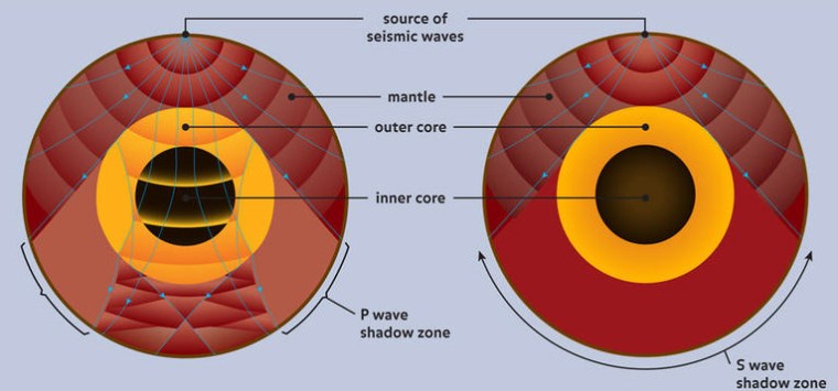 The layered structure of the Earth was discovered using the varying arrival times of seismic waves from major earthquakes, which pass through the Earth, at seismometer stations located across the planet’s surface. Analysis of these arrival times indicates the wavepaths taken through the planet, involving reflections and refractions at boundaries of materials with distinctly different physical properties. S-waves from an earthquake do not arrive in a wide ‘shadow zone’ around its antipode. Since that kind of wave depends on shearing and cannot pass through liquid the shadow reveals the presence of an outer core made of very dense liquid iron and nickel. P-waves that travel in a manner akin to sound waves also show a shadow but it is annular in form around the antipode because of refraction at the core-mantle boundary, but they do penetrate to reach the antipode. However, their arrival times there show faster speeds than expected from an entirely liquid core, and so reveal a central mass, the inner core, which is a ball of solid iron-nickel alloy about 70% of the Moon’s size.