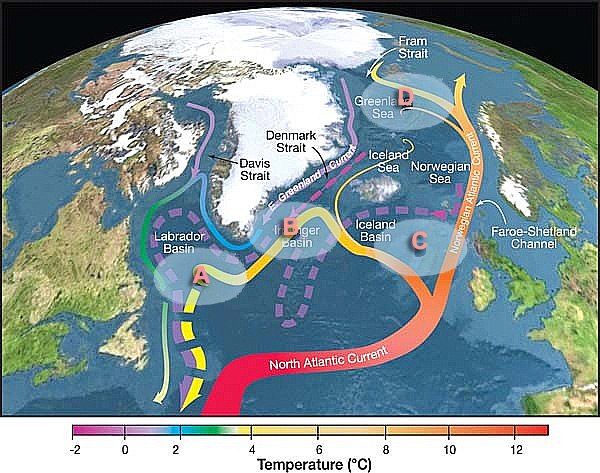 Location of the 4 regions in the northern North Atlantic used by Ma et al. in their modelling of AMOC: A Labrador Sea; B Irminger Basin; C NE Atlantic; D Nordic Seas. Colour chart refers to current temperature. Solid line – surface currents, dashed line – deep currents