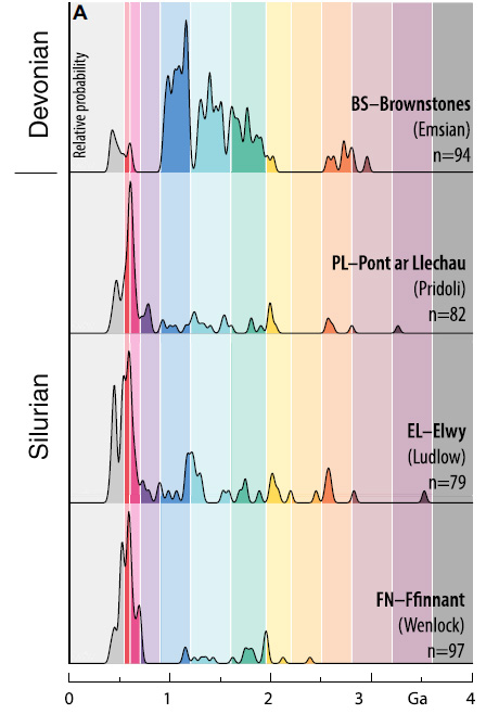 John Waldron and colleagues from the University of Alberta and Acadia University in Canada and the British Geological Survey addressed this issue by extracting zircons from four late Silurian and early Devonian sandstones in North and South Wales. These sediments had been deposited between 433 and 393 Ma ago at the southernmost edge of the British Caledonide terrane assemblage towards the end of terrane assembly. The team dated roughly 250 zircons from each sandstone using the 207Pb/206Pb and 206Pb/238U methods. Each produced a range of ages, presumed to be those of igneous rocks from whose magma the zircon grains had crystallised. These data are expressed as plots of probable frequency against age. Each pattern of ages is assumed to be a ‘fingerprint’ for the continental crust from which the zircons were eroded and transported to their resting place in their host sediment. In this case, the researchers were hoping to see signs of continental crust from the other side of the Caledonian orogen; i.e. from the Precambrian basement of the Laurentia continent.