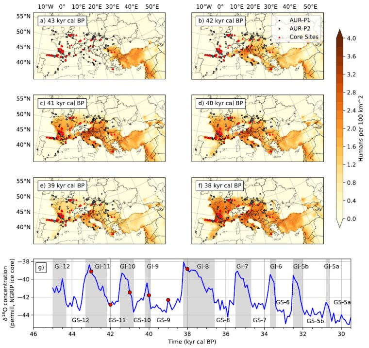 Maps of estimated anatomically modern human population density during the first six thousand years of Aurignacian migration and palaeoclimate record from the Greenland NGRIP ice core, with shaded warm episodes – red spots indicate the time of the population estimates above. (Credit: Shao et al. Fig. 1)