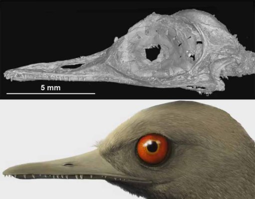 The amber specimen, from Middle Cretaceous (99 Ma) sediments, contains a perfectly preserved skull less than 2 cm long. At first glance it appears to be that of a tiny bird. The authors used micro-CT scanning to reconstruct the entire skull in 3-D. Although superficially resembling that of a bird, with eye sockets ringed by scleral ossicles that modern birds also have. These suggest that the animal was active during the daytime. Its beak-like jaws have many small teeth, as do many ancient fossil birds but not modern ones. These features led to its name: Oculudentavis khaungraaeI, translated as ‘eye-tooth bird’. So, is it a bird? A number of features shown by the skull suggest that, strictly speaking, it is not. Anatomically, it is a dinosaur, possibly descended from earlier types, such as the Jurassic winged and feathered dinosaur Archaeopterix, which evolved to early, true birds with which Oculudentavis coexisted during the Cretaceous Period. Having teeth, it was probably carnivorous and preyed on invertebrates: it may have been fatally attracted to tree resin in which insects had been trapped.