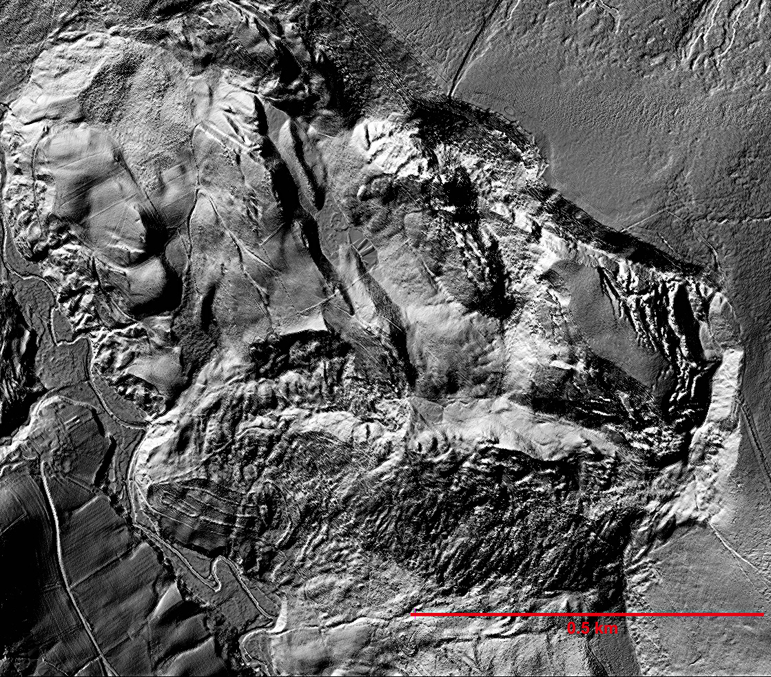 The most risky places are those with a history of landslides etc. So detailed mapping of such risk-prone ground is clearly needed. The UK has a large number of sites where mass wasting has been recorded, and below are lidar images of three of the most spectacular. Undoubtedly, there are other areas where no recent movements have been recorded, but which may ‘go off’ under changed climatic conditions. One of the best documented risky areas is in the English West Midlands within the new city of Telford. It follows the flanks of the River Severn as it passes through the Ironbridge Gorge that was cut by subglacial meltwater after the last glacial maximum. This area is also recognised as having been the birthplace of the Industrial Revolution. In 1714 Abraham Darby pioneered the use of coke in iron smelting and mass production of cast iron at Coalbrookdale a few kilometres to the east. The Severn also powered numerous forges and other heavy industries in the 18th and 19th centuries. Industrial activity and townships in the Gorge have been plagued by large-scale mass wasting throughout subsequent history and no doubt long before. An excellent illustrated guide to the area has been produced by the Shropshire Geological Society (Rayner, C. et al. 2007. A Geological Trail through the landslides of Ironbridge Gorge, Proceedings of the Shropshire Geological Society, v. 12, p. 39-52; ISSN 1750-8568)