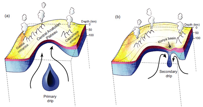 Seismic tomography shows that in a large volume 100 to 200 km beneath the central part of the Plateau S-waves travel faster than in the surrounding mantle. The higher speed suggests a body that is denser and more rigid than its surroundings. This could be a sinking, detached block of ‘eclogitised’ lithosphere whose disconnection from the remaining continental lithosphere has been causing the uplift of the Plateau that began in the Late Miocene. A smaller high-speed anomaly lies directly under the Konya Basin, but at a shallower depth (50 to 80 km) just beneath the lithosphere-asthenosphere boundary. The authors suggest that this is another piece of the lower lithosphere that is beginning to sink and become a ‘drip’. Still mechanically attached to the lithosphere the sinking dense block is dragging the surface down.