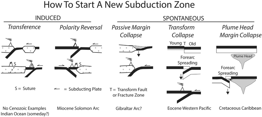 Robert Stern of the University of Texas at Dallas, USA, and Taras Gerya of ETH, Zurich, have produced a masterly review of how subduction gets started from place to place, and from time to time in geological history (Stern, R.J. & Gerya, T. 2018. Subduction initiation in nature and models: A review. Tectonophysics, v. 744 (in press); (PDF). It is the foundering of oceanic lithosphere into the mantle and gravity that give modern plate tectonics the bulk of energy that drives it along by slab pull. Yet the mantle’s consumption of a lithospheric slab somehow has to be set in motion from the symmetrical spreading of ocean floor as occurs either side of a constructive margin. It could not happen were the lithosphere to retain its low bulk density relative to mantle peridotite for all time. Moreover, it wouldn’t last for long were the lithosphere not to retain its strength through hundreds of kilometres depth as it sinks into the mantle. Active subduction zones have consumed vast amounts of oceanic lithosphere, for more than 65 million years, especially in fast-spreading ocean basins such as the western and eastern Pacific. The record is held by the destructive margin on the west flank of South America where more than 150 million years-worth of eastern Pacific lithosphere has been swallowed. Yet in order for oceanic lithosphere, which is stronger than that beneath the continents, somehow to fail and begin to sink a linear weak zone must develop at the interface between two incipient new plates. On top of that, all subduction on Earth is one-sided. A simple mechanism involving just thermal convection predicts that both plates either side of a break would have similar density so both should sink, more or less symmetrically.