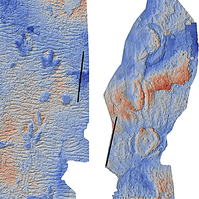 The Prince Charles’s Point site is partly covered by large basalt boulders, which perhaps account for the excellent preservation of the bedding surfaces from wave action. Two kinds of footprint are preserved (see image): those made by three-toed feet and by elephant-like feet that ‘squidged-up’ sediment surrounding than. Respectively these are suggested to represent the hind limbs of bipedal carnivorous theropods and quadrupedal herbivorous sauropods. They show that individual dinosaurs moved in multiple directions, but there is no evidence for gregarious behaviour, such as parallel trackways of several animals. They occur on two adjacent bedding surfaces so represent a very short period of time, perhaps a few days. The authors suggest that several individual animals were milling around, with more sauropods than theropods. What such behaviour represents is unclear. The water in an estuarine lagoon would likely have been fresh or brackish. They may have been drinking or perhaps there was some plants or carcases worth eating ? That might explain both kinds of dinosaurs’ milling around. The sizes of both sauropod and theropod prints average about 0.5 m. The stride lengths of the theropods suggest that they were between 5 to 7 metres long with a hip height of around 1.85 m. Their footprints resemble those reconstructed from skeletal remains of Middle Jurassic Megalosaurus, the first dinosaur to be named (by William Buckland in 1827). The sauropods had estimated hip heights of around 2 m so they may have been similar in size (around 16 m) to the Middle Jurassic Cetiosaurus, the first sauropod to be named (by Richard Owen in 1842).